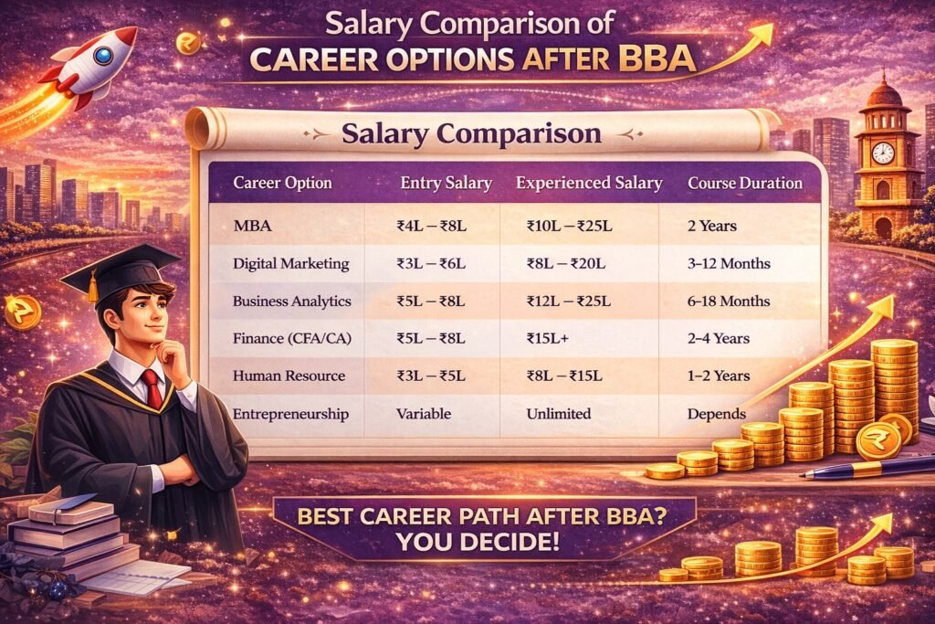 MBA is one of the most popular career options after BBA because it provides advanced management knowledge and leadership skills. However, it is not the only option. Skill-based careers such as digital marketing, analytics, and finance certifications can also offer excellent salary potential and faster career entry.